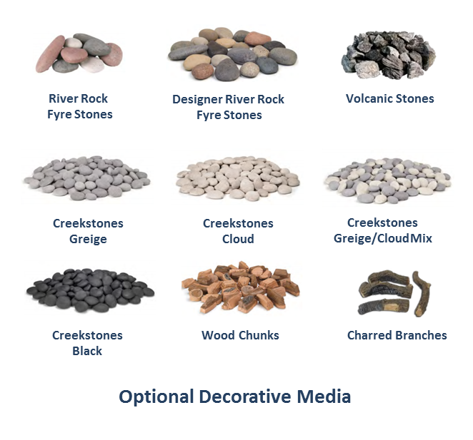 - Decorative Media:Β River Stones, Volcanic Stones, Creekstone's, Concrete "Wood Chunks", Concrete "Branches", etc.Β - must be placed on top of Required Fire Media.