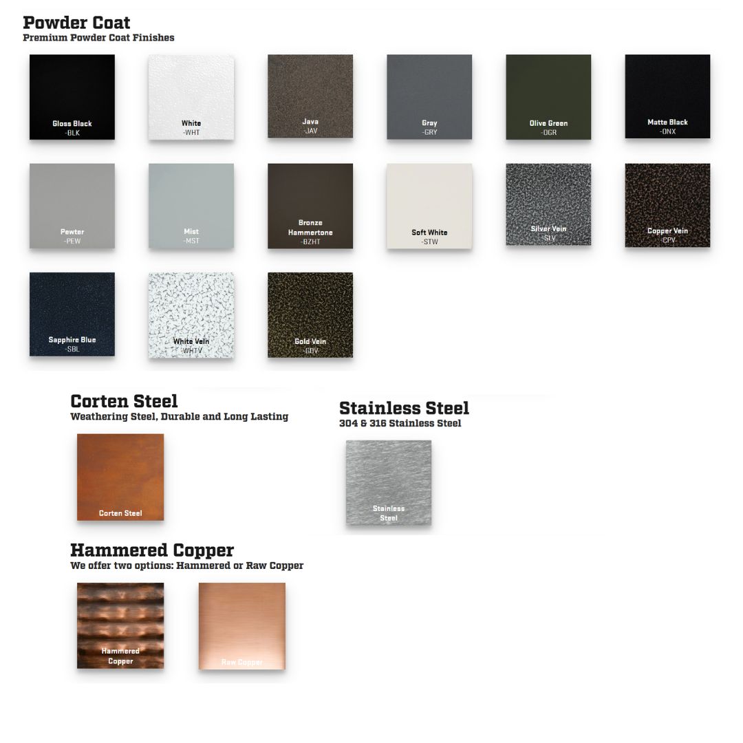 - Finish: White Powdercoat, Black Powdercoat, Gray Powdercoat, Copper Vein Powdercoat, Pewter Powdercoat, Java Powdercoat, Silven Vein Powdercoat, Hammered Copper, Stainless Steel or Corten Steel. The Powdercoat finish has a slight texture. Copper will change its color into a blue/green hue over time due to its natural properties and surrounding environment.